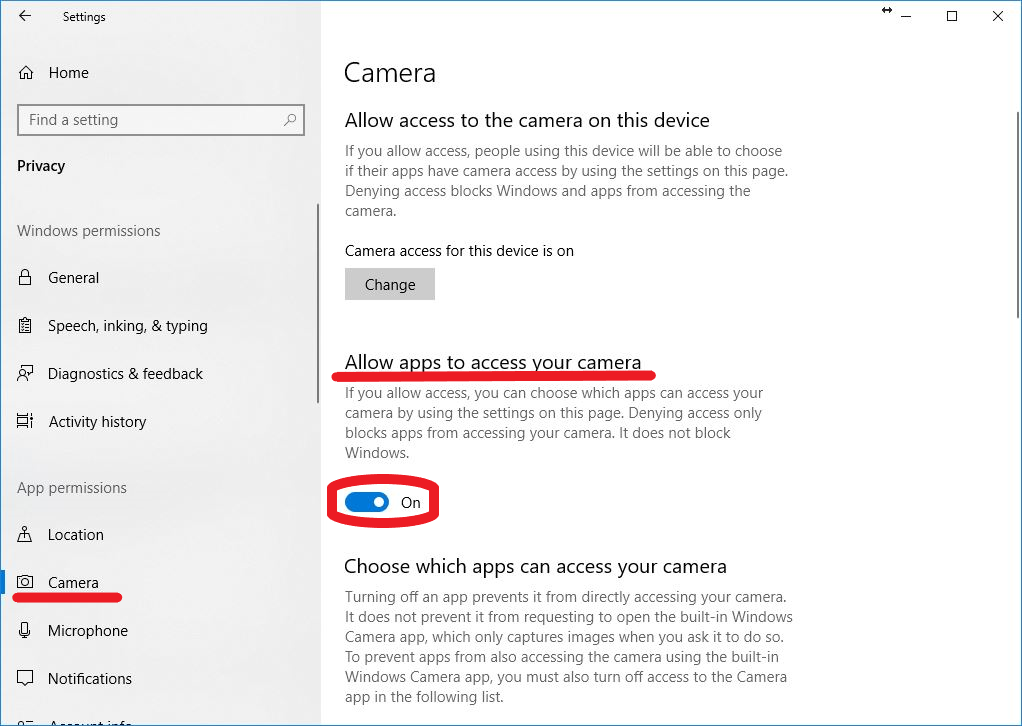 Below the heading Allow apps to access your camera the toggle switch should be set to On.
